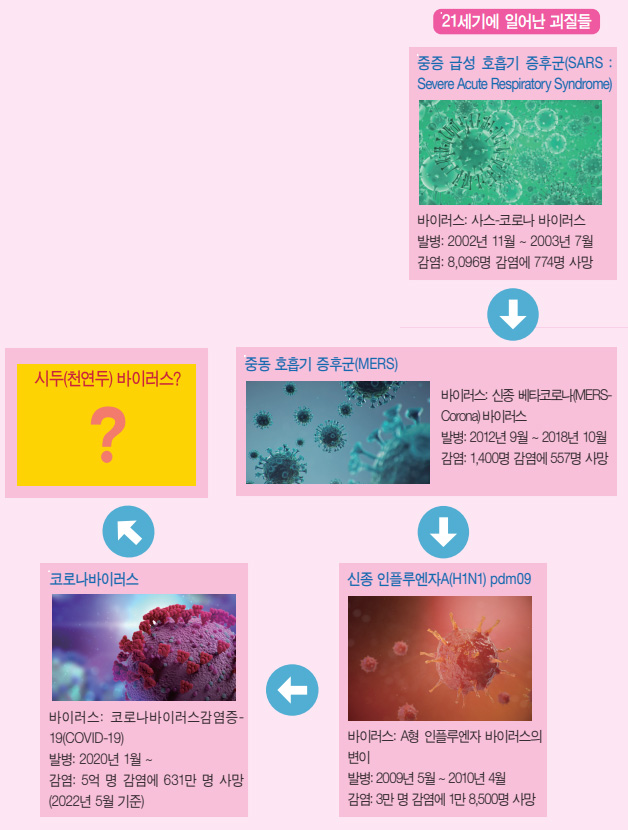또한 김우주 교수는 “어차피 만병통치약은 없지만 리스크(위험)를 최소화해야 한다.”라며 “감염병을 조기 발견, 조기 치료할 감시 체계를 갖추고 백신, 치료제 확보 노력을 계속해 나가야 한다.”라고 했다. 인류의 삶 속에서 바이러스는 사라지지 않고 끊임없이 진화하고 있다. 그리고 진화하는 바이러스에 대한 완전한 정복은 인류의 영원한 숙제로 남게 될 것이다. 현재 코로나19 팬데믹Pandemic(세계적 대유행)이 엔데믹Endemic(풍토병으로 굳어진 감염병)으로 향해 가는 가운데, 이제 인류가 40여 년 전 사망 선고한 천연두가 ‘넥스트 팬데믹’ 후보로 등장했다.