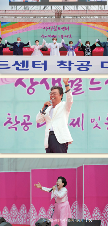 이어진 테너 류정필 님의 ‘내 나라 대한’, ‘민요 메들리’ 공연에서 이 ‘아리랑’의 의미를 목청껏 외쳐 볼 기회가 왔다. 류정필 님은 이 자리가 우리 민족의 의미를 되새길 수 있는 자리라고 생각되니 ‘지화자’를 떠나가도록 외쳐 보기를 당부했다. 진도아리랑에 등장하는 ‘아라리가 났네.’라는 가사는 새 역사 개창의 주인공, 신과 함께, 신의 뜻을 실현하는 이 시대의 화랑, 즉 삼랑 신선들이 나온다는 뜻이다. 왜곡된 역사를 바로잡고 온 인류의 뿌리를 찾아 지구촌을 한 가족으로 만드는 그 첫걸음이 바로 이날이다. 상생월드센터 착공 대천제의 의미가 정말 깊다는 생각을 다시 한번 되새기게 된다. 이를 두고 왕종근 아나운서는 아리랑, 역사의 씨앗이 되는 사람이 멋지다고 평했다.