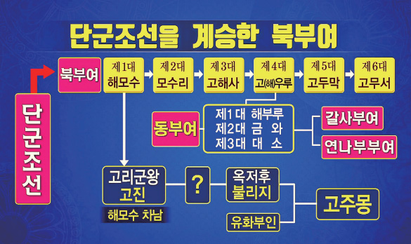 이로써 역사의 지각 변동이 또 한 번 일어나게 되는데 해부루解夫婁 단군이 도읍을 가섭원으로 옮기게 된 것이다. 이를 가섭원부여迦葉原夫餘 또는 동부여東夫餘라고 한다. 이 동부여에서 다시 갈사부여曷思夫餘가 나오고 서부여西夫餘(연나부부여椽那部夫餘)가 갈라지게 된다. 우리는 『환단고기』를 통해 복잡하게 얽힌 부여의 역사를 일목요연하게 정리할 수 있다.