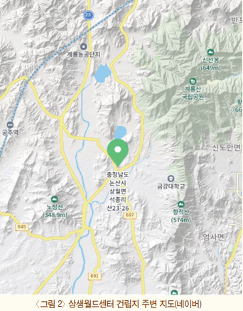 상생월드센터를 세우는 일은 증산도 지도자들의 ‘큰 그림’ 완결판이다. 현재 충청남도 논산시 상월면 석종리 산23-26 대지에 건립이 추진되고 있는데 상생월드센터, 즉 상월센터가 상월면에 세워지는 것 자체가 정말 신기한 일이다. 이명수 국회의원 말마따나 하늘이 점지한 곳인가. 필자는 약 2년 전 상생월드센터 건립 이야기를 어깨너머로 듣고 지도 〈그림 2〉를 살펴보며 두 번 놀랐다. 속설에 풍수지리 최고의 명당이 여성 자궁 모양이라고 하더니……. 정말 놀랍지 않은가! 상생월드센터 건립지가 풍수지리적 명당이라는 주장은 누군가 다시 소상히 밝혀 줄 것으로 믿는다.