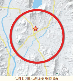 나는 〈그림 2〉를 확대한 〈그림 3〉을 보고 두 번째로 놀랐다. 여기서 별이 있는 곳이 바로 상생월드센터 건립지다. 하천이 계룡산에서 발원해 북동 방향으로부터 남서 방향으로 흐른다. 이 하천을 은하수로 보면 〈그림 3〉의 빨간 원 내부는 우리나라의 여름과 가을, 즉 하추기 밤하늘과 일치하게 된다! 만일 하천이 중간에 휘었거나 흐르는 방향이 조금만 달랐어도 이런 주장을 할 수는 없다.