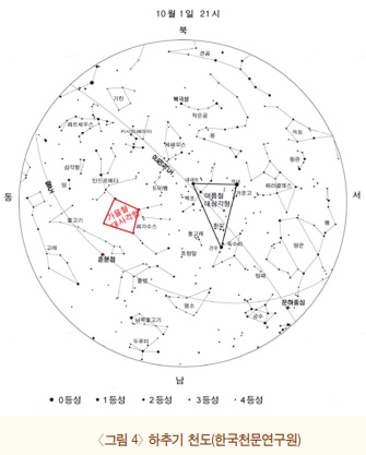 하추기 밤하늘에 대해 더 알아보자. 〈그림 4〉는 10월 1일 21시의 천도인데, 별들은 보름이 지나면 한 시간 일찍 뜨기 때문에 9월 15일 22시, 9월 1일 23시, 8월 15일 0시, 8월 1일 1시 천도라고 해도 틀리지 않는다. 이는 지구가 해를 공전하기 때문에 일어나는 현상이다. 즉 지구가 자전하기 때문에 별자리들이 매일 떴다 지고, 지구가 공전하기 때문에 별자리들이 계절에 따라 달라지는 것이다.