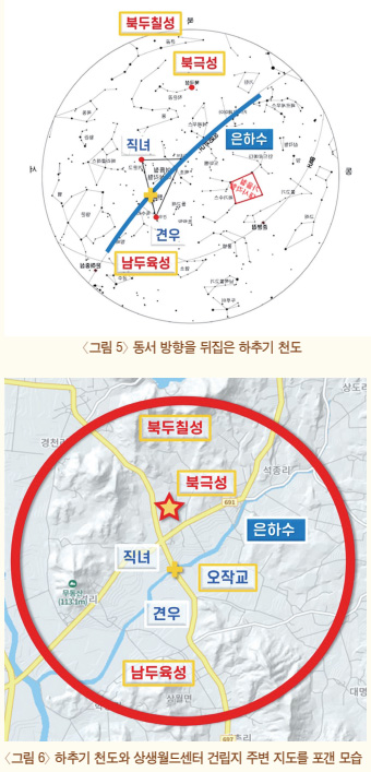〈그림 5〉는 〈그림 4〉의 동서 방향을 뒤집은 하추기 천도다. 글씨까지 모두 뒤집혀 있는 이것을 〈그림 3〉과 포개놓으면 〈그림 6〉이 된다. 자연스럽게 〈그림 7〉 석종교라는 다리는 오작교가 되고, 따라서 상생월드센터는 북극성이 된다! 따라서 앞으로 석종교 북쪽에 직녀성, 남쪽에 견우성을 상징하는 구조물이나 건물을 세우면 더욱 운치가 있을 것이다. 북두칠성과 남두육성은 각각 천도 북쪽과 남쪽 끝에 있는 야산에 해당한다. 남두육성은 북두칠성보다 작고 어두워서 더 야트막한 남쪽 산에 어울린다. 북두칠성은 사시사철 보이지만 남두육성은 하추기에만 볼 수 있다.