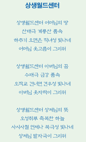 상생월드센터는 자연스럽게 세계 상생문화의 중심지가 될 것이다. 몇 년 후 맞이할 준공식은 지구촌 여기저기에서 몰려든 외국인들로 북적이지 않을까. 그렇다면 그 자리에서 세계적인 상생월드센터 주제가가 연주돼야 하지 않을까 싶다. 이런 생각을 하다 보니 이 글 내용으로 일단 주제가 가사를 만들고 싶었다. 그러던 중 어느 날 새벽 영감이 떠올라 아래 가사를 단숨에 써 내려갔다.