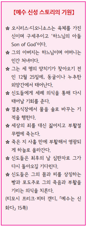 이교도의 영적 신앙은 사실상 고도로 발전한 문화의 세련된 산물이었다. …… 그것이 바로 ‘미스테리아 종교(Mystery religions)’다. …… 영적 지도자들은 미스테리아를 문명의 원천으로 간주했다. …… 고대 세계의 철학자들은 은밀한 미스테리아의 영적 스승들이었다. …… 미스테리아의 핵심에는 죽어서 부활한 신인神人과 관련된 여러 신화가 있었다. 이 신인은 여러 이름으로 알려져 있었다. 고대 이집트에서는 오시리스, 고대 그리스에서는 디오니소스, 소아시아에서는 아티스, 시리아에서는 아도니스, 이탈리아에서는 바쿠스, 페르시아에서는 미트라스로 불렸다. 근본적으로 이 신인들은 모두 동일한 존재다. …… 우리는 오시리스-디오니소스와 관련된 신화의 골자를 추려 내면 예수 전기를 속속들이 재구성할 수 있다는 것을 알게 되었다. - 티모시 프리크·피터 갠디, 『예수는 신화다』 13~15쪽