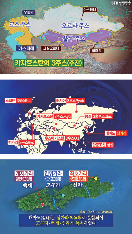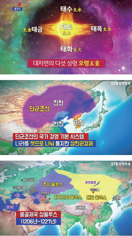 전 지구상에서, 특히 유목문화권에서 삼한관경의 유례를 찾아볼 수 있는데, 유라시아를 지배한 몽골이라든지, 중국에서 말한 흉노가 그러합니다. 흉노는 훈족인데 동서양의 실크로드 원형을 놓은 사람들입니다. 몽골족, 훈족, 돌궐족, 선비족 이 사람들이 다 삼수三數 체제로 나라를 다스렸습니다. 몽골의 좌현왕 우현왕 제도라든지 러시아의 삼 루스, 카자흐스탄의 삼 주스가 그런 예입니다.