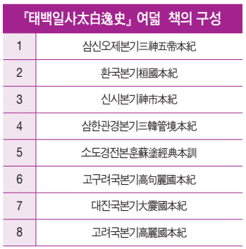 『환단고기』의 마지막에 들어 있는 조선 시대 이맥李陌(1455~1528)의 『태백일사太白逸史』는 여덟 권으로 되어 있습니다.