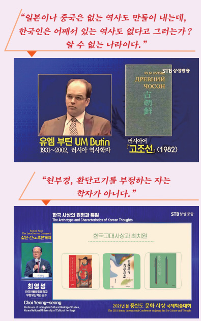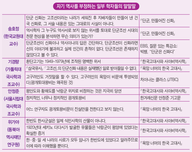 『삼국유사』를 보면 위서魏書를 빌어서, 2천 년 전 그러니까 지금부터 4천 년 전에 ‘단군왕검이 입도신시立都神市하고 개국호조선開國號朝鮮하니 여고동시與高同時’라 했습니다. 언제, 어디서, 누가, 어떤 나라를 세웠는지 분명히 밝힌 것입니다. 그런데도 그걸 부정하고 ‘단군조선은 신화다, 조작한 것이다.’라고 하고 광개토대왕비문도 고구려 사람들이 과장한 것이라고 말하는 사람들이 있어요.