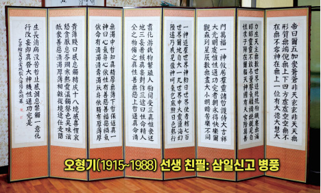 이 『환단고기』를 1980년 경신년 개천절에 낼 때, 배달의숙 초간본의 재판이라 했습니다. 책의 글자를 오형기吳炯基 선생이 썼습니다. 그 글씨가 이 병풍의 글씨와 똑같아요.