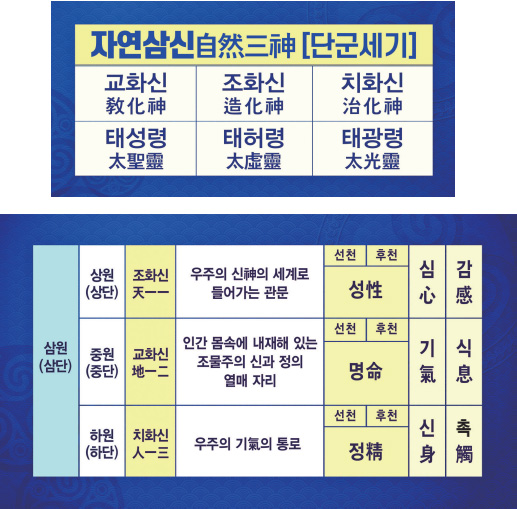 그런데 『환단고기』에서는 삼신 가운데 조화신造化神이 내려와서 나의 본래 마음 성性이 되고, 교화신敎化神이 내려와서 나의 명命이 되고 그리고 치화신治化神이 내려와서 나의 정精이 됐다고 합니다.
