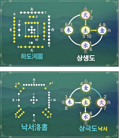 하도에는 여름에서 가을로 넘어가는 원칙적인 우주의 변화 원리가 나오고, 낙서에는 우주의 또 다른 이치인 상극이 들어 있습니다.
