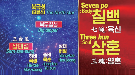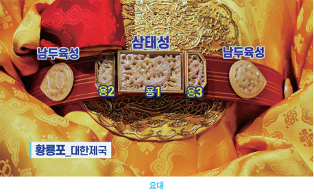 우리가 대구 박물관을 가보면 옛날 왕과 고관대작들이 찼던 요대腰帶가 있습니다. 그 요대에 칠성과 삼태성, 남두육성이 있습니다. 이 남두육성을 아는 도인들이 없어요. 우리나라뿐만 아니라 전 지구에 남두육성 이름을 아는 도인이 없는 것입니다. 북두칠성에서 우리가 몸을 받고, 삼태성인 허정虛精, 육순六淳, 곡생曲生이라는 별에서 우리가 탯줄을 받습니다. 그리고 사람이 죽으면 칠성판에 누운 상태로 운구되어 저승으로 갑니다. 이 칠성을 북두北斗라고도 합니다. 그래서 우리가 ‘북두, 남두, 삼태 대주신大主神님들이시여.’ 하고 기도를 하거든요.