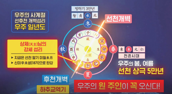우주 1년은 129,600년으로 선천, 후천으로 둥글어 갑니다. 이 先天과 후천개벽後天開闢이라는 말은 인간으로 오신 증산 상제님이 처음 쓰신 겁니다. 선천, 후천개벽이란 말은 주역, 정역, 동학 어디에도 없고 『도전』에만 나옵니다. 우주 1년 도표를 보면 누구도 알기 쉽게 되어 있어요. 우주에 인간 농사를 짓는 1년이 있습니다. 그것은 지구 시간으로 129,600년입니다. 인간의 문명은 우주 봄여름의 5만 년 동안 발전합니다. 그 5만 년이 선천입니다. 후천도 5만 년이 있습니다. 그리고 우주의 큰 겨울 빙하기가 한 3만 년이 있어요. 이 빙하기를 깨뜨리는 이치가 바로 토극수土克水거든요. 우주의 겨울에서 봄으로 넘어갈 때는 개벽을 하는데 이게 선천개벽先天開闢입니다. 여기서 우주의 어떤 상극이 처음 태동하고 빙하가 녹으면서 새로운 우주의 1년, 봄이 열립니다. 그때 새로운 원시 인간들이 나오게 되는 것입니다.