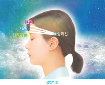 우리의 머리는 축구공보다 작다고 할 수 있지만 뒷골의 중앙에 밥알만 한 송과선松果腺이 있습니다. 이 송과선은 우주의 무궁한 삼신의 조화, 신의 세계로 들어가는 문입니다. 그 문이 아래는 무형으로 돼 있고 위는 유형으로 돼 있어요. 이게 태극의 음양적인 하나의 존재 방식입니다.