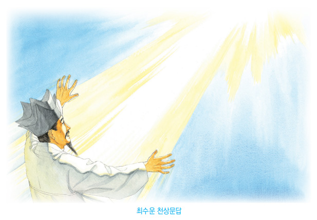 최수운 이전, 최수운 이후 인류 지성사의 흐름에서 최수운 대신사는 우주의 주재자 하나님(상제님, 천주님)의 음성을 들으며 대화를 나눈 빛나는 분입니다. 7~8개월 지속된 이 사건을 천상문답天上問答이라고도 부르는데 동서양의 어떤 기록을 막론하고 유일한 사건입니다. 이를 통하여 수운은 인류에게 상제님을 모시는(侍天主) 시간대를 열어 주었습니다.