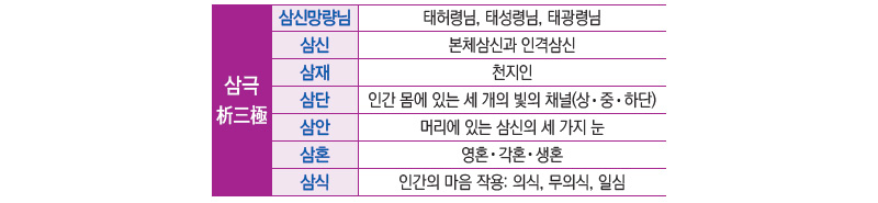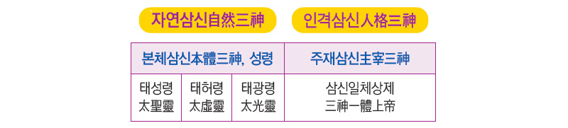 태허령님과 그 좌우에 보필하는 두 분이 계시는데 그 보필하는 두 분은 태성령太聖靈님과 태광령太光靈님입니다. 그래서 우주의 무형의 조물주로서 삼신이 계신다는 거예요. 마고삼신 할머니가 이 대우주의 신선의 원조로서 이것을 정의해 주셨어요.