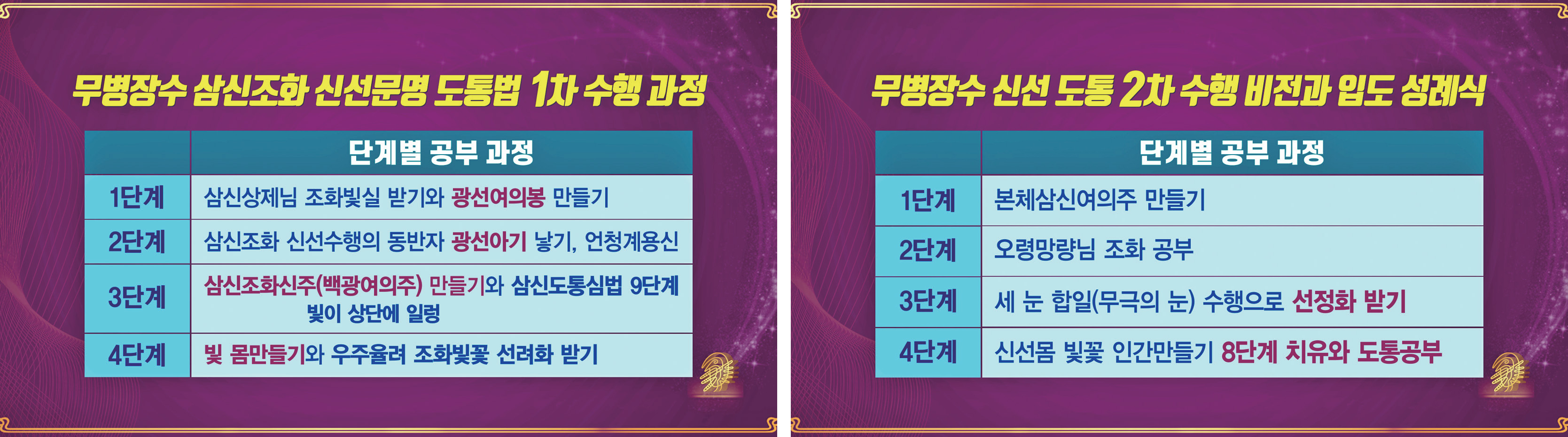 앞으로 2차 수행에 들어가면 우리 몸을 진짜 신선 몸으로 만드는 공부가 있습니다. 우리의 세포 유전자로 하여금 시간을 역행해서 한 살짜리로 거슬러 올라가게 하는 소위 갱소년更少年 망량으로 전환시키는 공부가 2차 수행에 있어요. 2차 수행은 항목이 한 스무 가지 정도 되는데 항목마다 일반인이 볼 때는 기적과도 같은 것입니다. 지금 이런 단계를 수행하는 도생이 수천 명에 이릅니다.