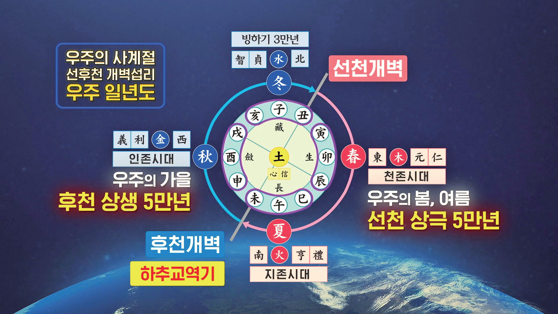 지금은 병란개벽기이기 때문에 우주 1년이라는 시간대를 알아야 합니다. 그래야 우주와 인간의 문제, 생태계 파괴와 기후 변화 같은 문제를 바르게 인식할 수 있습니다. 앞으로 문명은 어떤 방향으로 가는가? 그냥 종말론적인 상황으로 가는 것이 아닙니다. 바로 이 문제를 해결해 주는 것은 현대 문명의 출발점인 동학에서 나온, 천주 아버지의 조화법입니다. 이것은 ‘시천주 조화정 영세불망 만사지 지기금지 원위대강’ 스물한 자의 진리 핵심입니다. 그러니까 이 대우주의 진리 주제라는 것은 동학에서 선포된 천지의 원주인原主人이신 천주 아버지입니다. 천주 아버지는 우주의 통치자이기 때문에 정치공학의 언어를 써서 ‘상제님’이라 합니다.