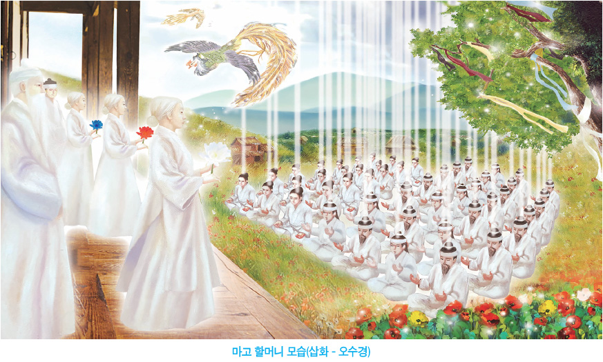 마고삼신 할머니는 말할 수 없이 신성하고 진정으로 숭고한, 온 인류의 생명의 근원이며 큰 조상입니다. 우주의 아버지 상제님께서 그분에게 ‘마고麻姑 태원성모太元聖母’라는 도호를 내려 주셨습니다. 도호에 클 태太 자, 으뜸 원元 자, 원형이정元亨利貞이라 할 때 그 원 자를 쓰셨는데요, 제가 상제님의 그 말씀을 들었을 때 번개가 쳤어요. 그 말씀이 가슴을 꿰뚫었습니다.
