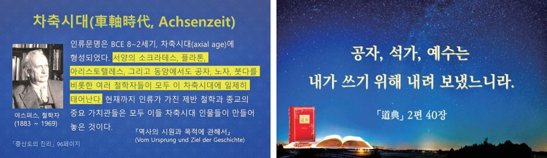 상제님께서는 왜 우리 동방 땅 조선에 강세하시게 되었을까? 이를 위해서는 먼저 인류 문화와 문명을 연 성자들과 지혜의 시작이 언제부터 비롯된 것인지 알아야 한다. 현재까지 알려진 바에 따르면 인류가 가진 모든 철학과 종교 등의 중요 가치관들은 비슷한 시기에 형성되었다. 독일의 철학자 칼 야스퍼스Karl Jaspers(1883~1969)는 『역사의 기원과 목표(The Origin and Goal of History)』라는 저서에서 이를 ‘차축 시대車軸時代’(die Achsenzeit)라 표현한 바 있다.