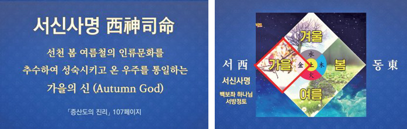 상제님은 천지를 밭으로 삼아 인간 농사를 지으시는 삼계 우주의 절대자 하느님으로, 상제님께서는 당신의 정체를 ‘서신西神’이라 밝혀 주셨다. 서신은 선천 봄⋅여름철의 인류 문화를 추수하여 성숙시키고 온 우주를 통일하는 가을의 신(Autumn God)이다.