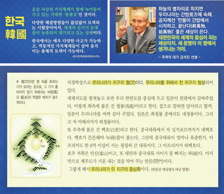 상제님께서 강세하신 한반도韓半島에 대해 안운산 태상종도사님께서는 “이 한반도가 바로 지구의 혈穴 자리이기 때문에 우주 주재자인 상제님께서 이 세상에 오실 때, 오직 이 조선 땅에 강세하실 수밖에 없다.”는 가르침을 처음 열어 주셨다. 이는 지리학地理學의 결론이라고 할 수 있다.