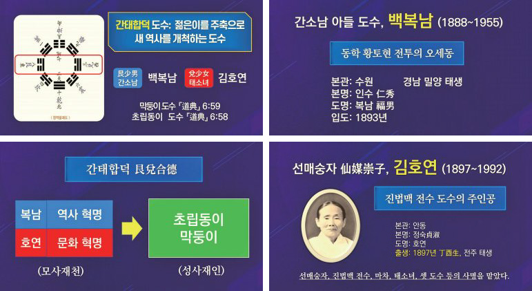 가장 먼저 도문에 들어온 이들은 어린이들이다. 바로 간태합덕艮兌合德 도수의 주인공인 간소남 백복남과 태소녀이자 선매숭자 도수의 주인공인 김호연 성도로, 도전이 간행되는 과정에서 그 비밀이 세상에 드러나게 되었다. 두 분의 성도는 상제님 무극대도의 실체를 드러내어 진법 판이 열리는 데 결정적인 기여를 하였다.