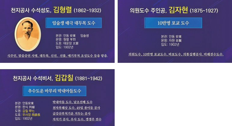 조선의 국운이 급속하게 쇠락하여 러일전쟁과 을사늑약이 있던 당시에는 10만 명 포교 도수의 류찬명柳贊明 성도, 천자부해상 공사의 신원일辛元一 성도, 출장입상出將入相의 능력과 비범한 기억력을 지녔지만 때나 기다리며 입신양명을 꿈꾸었고 어천 후에는 상제님을 믿지 말라는 망발을 하다가 벼락을 맞아 죽은 김광찬金光贊 성도 등이 있었다.