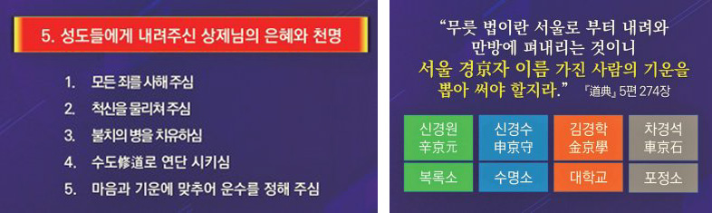 즉 인간과 천지 만물의 수명을 관장하는 천상의 성소인 수명소는 신경수申京守 성도, 인격 도야와 학문의 전당인 대학교 도수는 김경학金京學 성도, 지상 인류의 행복과 녹줄을 주재하는 성소인 복록소는 신경원辛京元 성도에게 맡기셨음을 확인할 수 있다.