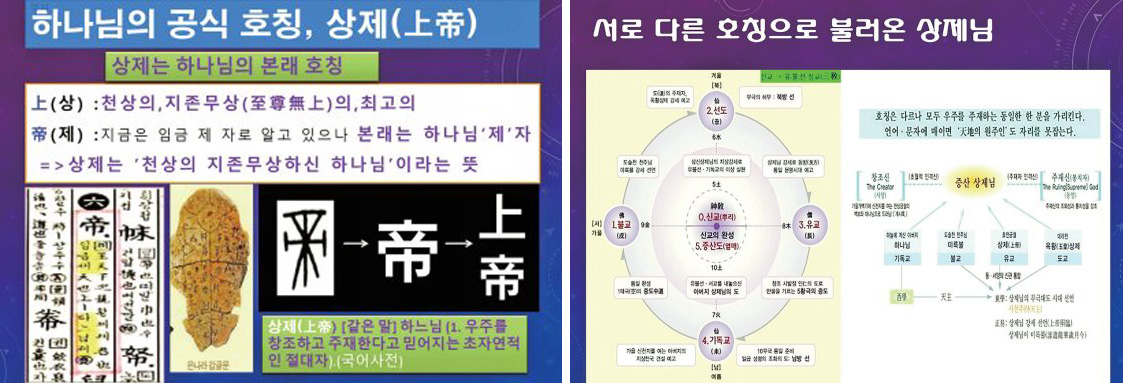 여기서 상제님의 여러 호칭이 나오는데, 동방 배달 한민족은 삼신일체상제님, 삼신상제님, 또는 하느님이라고 불렀다. 또한 선도에서 유래한 옥황상제玉皇上帝라는 호칭은 하느님을 인격적으로 표현한 말이다. 유불선을 통합한 후천의 선도인 동학은 ‘시천주侍天主 신앙’을 말하였다.