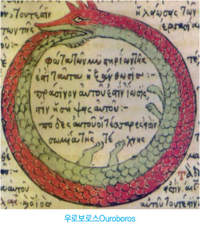 우로보로스는 우주적인 용(뱀)으로 신성한 원을 상징합니다. 원圓은 무한히 회전하므로 완전성과 전체성, 불멸성, 동시성 등을 나타냅니다. 그래서 하느님과 하느님이 만든 우주, 하늘을 원으로 표상합니다.