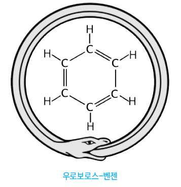 꿈속에서 눈앞에 떠다니는 탄소 원자와 수소 원자가 여러 모양으로 변했습니다. 어느 순간 원자가 한 마리 뱀으로 변해서 빙글빙글 돌더니 자기 꼬리를 물고 둥근 고리를 만들었습니다. 그 모습을 보고 깜짝 놀라 깨어난 그는 연필을 들고 탄소 원자를 그렸습니다. 그리고 이를 정리해 1865년 벤젠 고리 구조를 세상에 발표했습니다.
