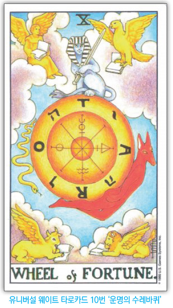 따라서 회전하는 원은 대우주의 윤회일 뿐만 아니라 소우주의 윤회이기도 합니다. 윤회는 자이나교, 힌두교, 타로 등에서 ‘존재의 수레바퀴’라는 개념과 상징물로 나타납니다. 신화 속의 우로보로스가 종교 시대에 윤회 사상으로 재탄생한 것입니다.