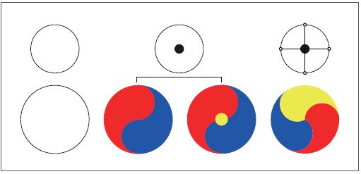 심판이 공을 운동장의 가운데에 놓고 공격과 수비를 정합니다. 이제 선수들의 모든 관심이 공에 집중됩니다. 경기의 시작을 알리는 심판의 호각 소리를 기다리며 긴장감만 흐르고 있습니다. 이처럼 음과 양의 구심점이 생겨서 때가 되면 즉시 동動할 수 있는 상태를 ‘수태극水太極’이라고 합니다. 도형으로 나타내면 ‘중심축이 있는 원’과 같습니다.