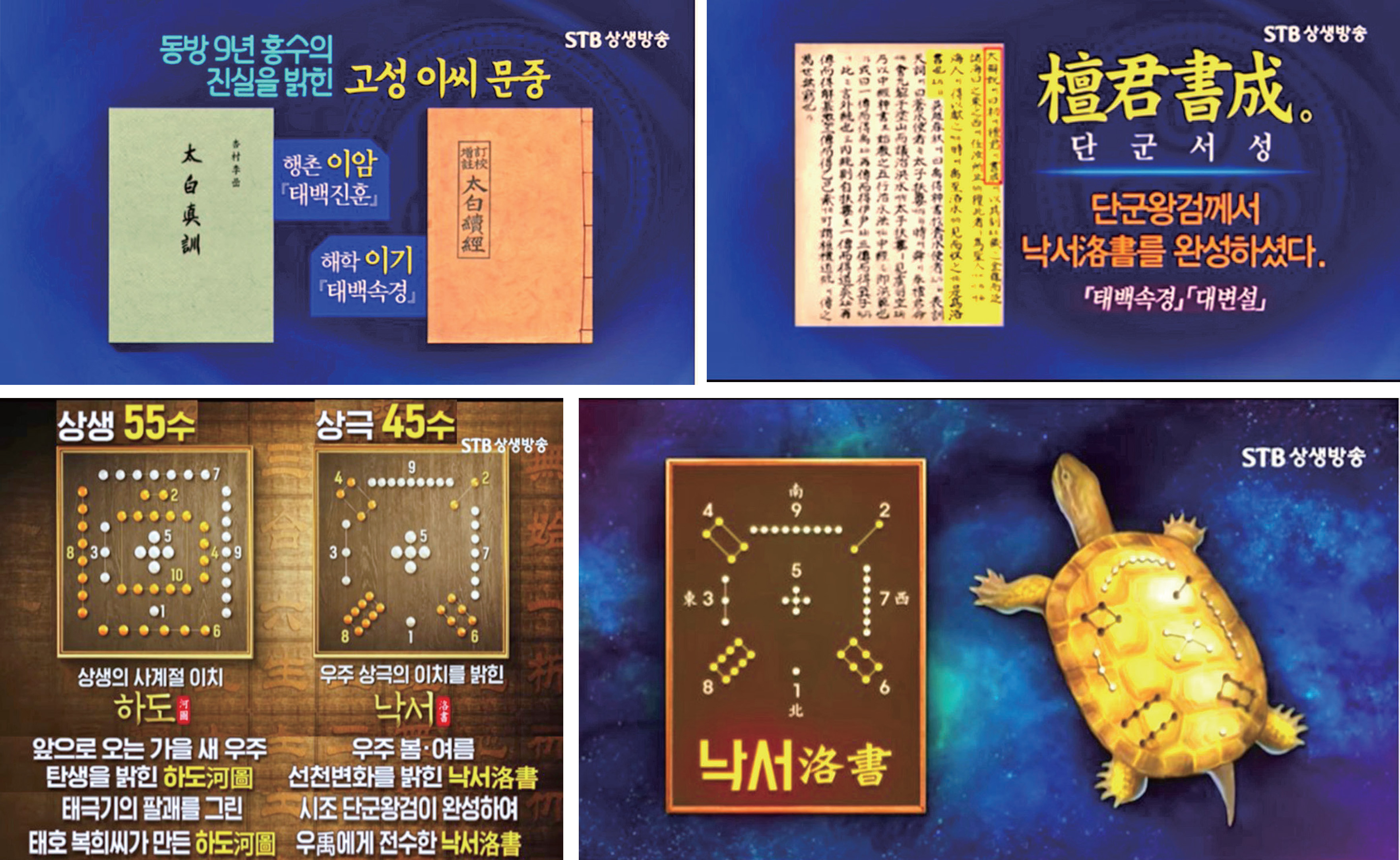 “단군왕검께서 낙서洛書를 완성하셨다(檀君書成). ‘동쪽으로 가든 서쪽으로 가든 네(金龜: 금 거북이)가 가는 대로 맡기리라. 이것을 얻는 자는 성인이리라.’ 해인(어부)이 금 거북을 잡아 바쳤는데, 당시에 우가 낙수洛水에 이르렀다가 금 거북을 전해 받으니, 이것이 낙서이니라.”