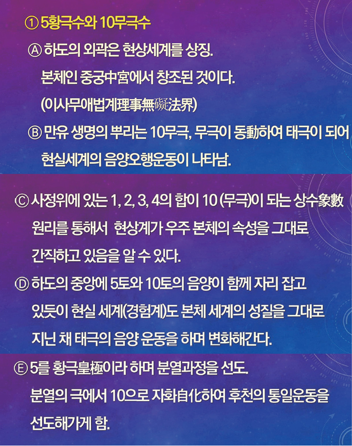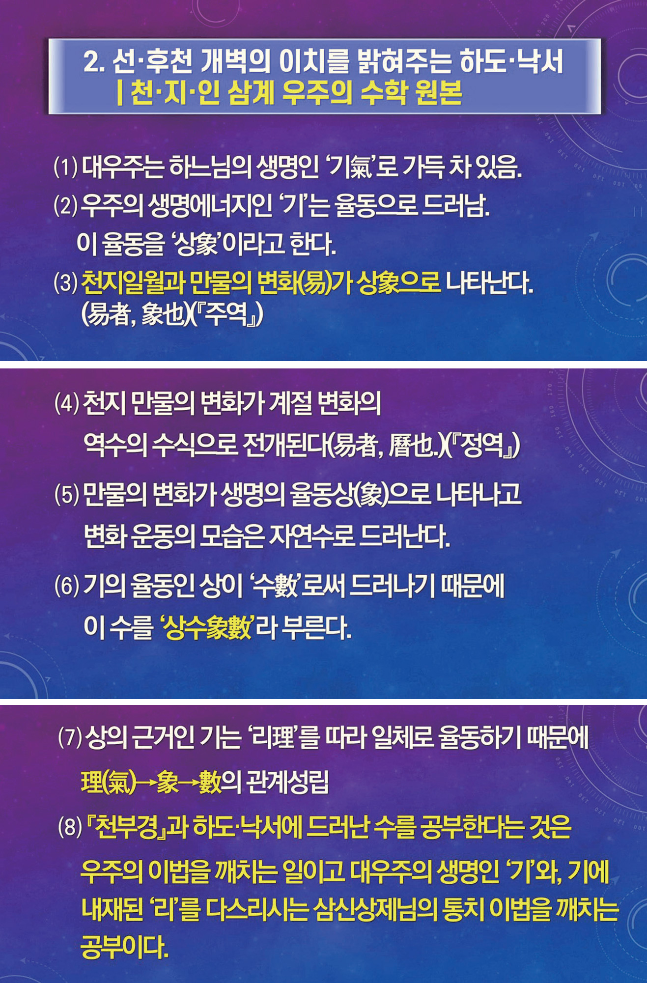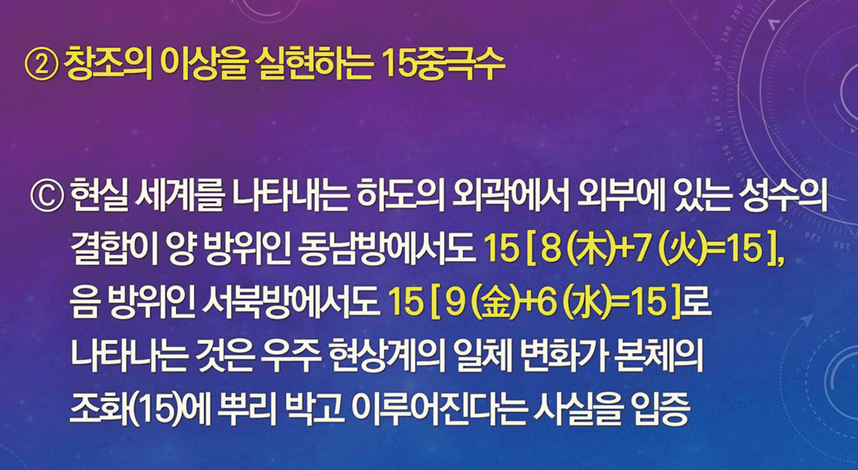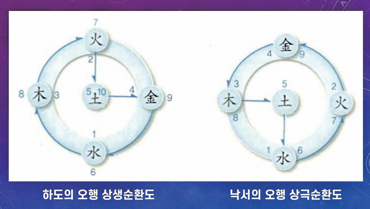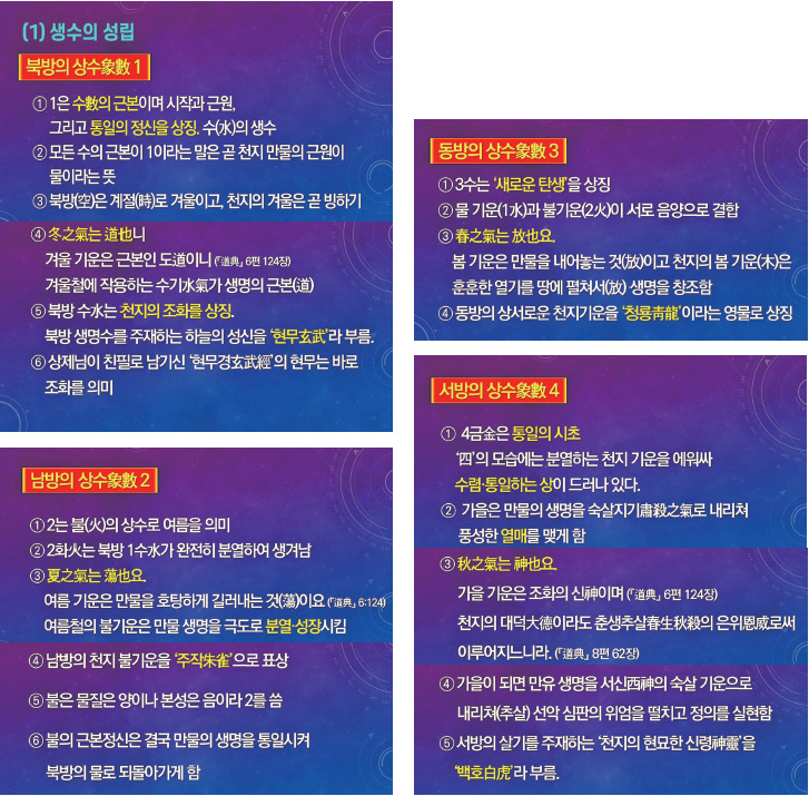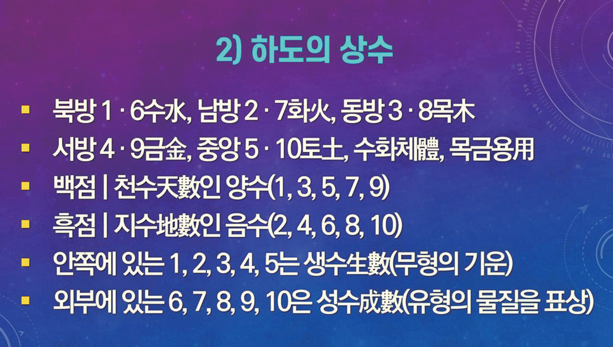(2)하도에는 상생의 천지 변화 이치가 나타나 있고, 낙서에는 선천 역사를 지배해 온 상극의 변화 이치가 드러나 있다(낙서 선천, 하도 후천).