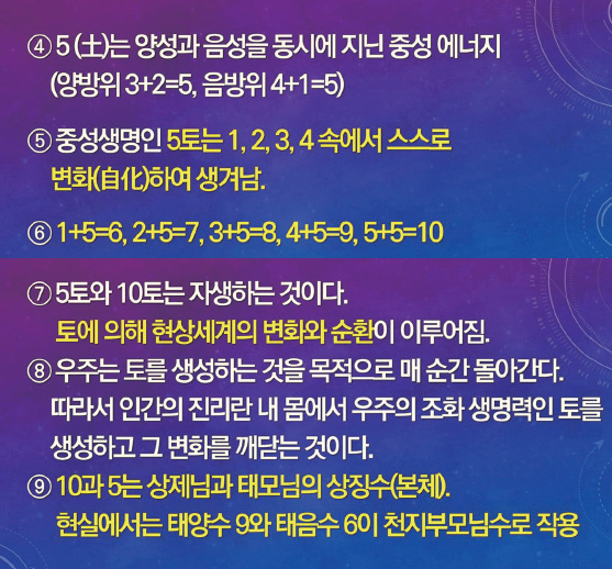 각 방위(계절)에 배치되어 생명[기氣]의 변화성을 밝혀 주는 상수象數가 생수生數와 성수成數로 구성되어 있는 이유는 무엇일까? 바로 우주 생명이 천지 만물을 지어낼[생生, creating] 수 있는 설계의 능력과 그 변화를 실현할[성成, becoming] 수 있는 조화 능력을 동시에 지니고 있음을 뜻한다. 즉 생수를 바탕으로 중앙의 5⋅10토가 생겨나고 이 토土에 의해 우주 창조의 변화가 일어난다. 우리 인생은 이 토를 만나기 위해 존재하는 게 아닐까?