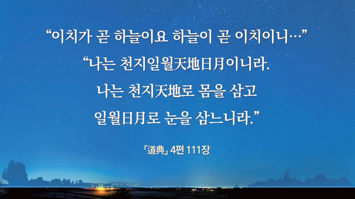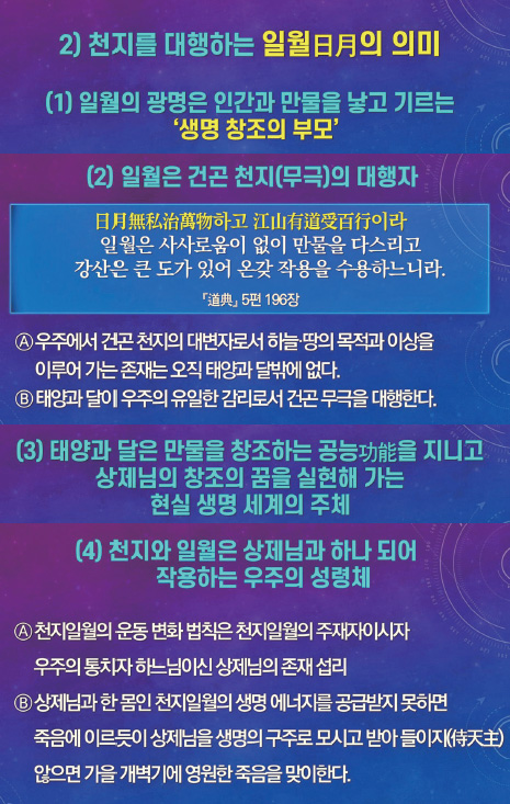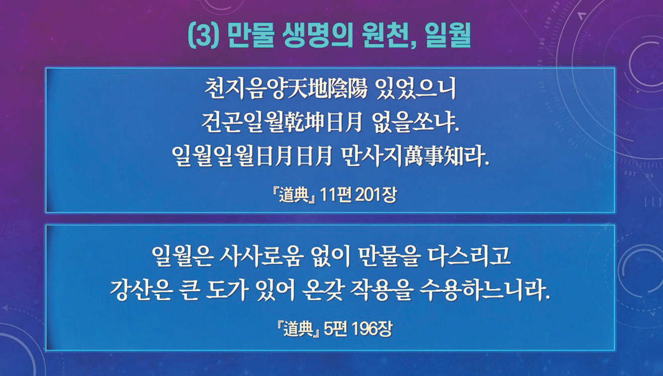 천지 만물은 한순간도 쉬지 않고 변화하고 있다. 이런 만물의 변화는 대우주 천제의 끊임없는 음양 순환 운동에서 비롯하는데, 상제님께서는 ‘도의 정신, 도의 질서를 시간 도수로 그려 내는 것은 일월日月이 한다.’고 말씀하셨다.