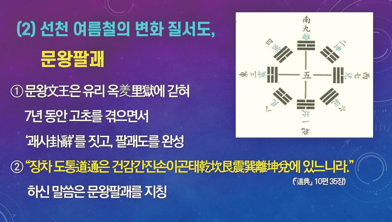 문왕팔괘도文王八卦圖는 오행이 상극하는 가운데 인류 역사가 발전해 나가는 우주 여름철의 변화 이치를 밝히고 있다. 중앙에 낙서의 5토가 자리 잡아 여름철에 5황극을 중심으로 분열하고 발전하는 모습을 담고 있다.