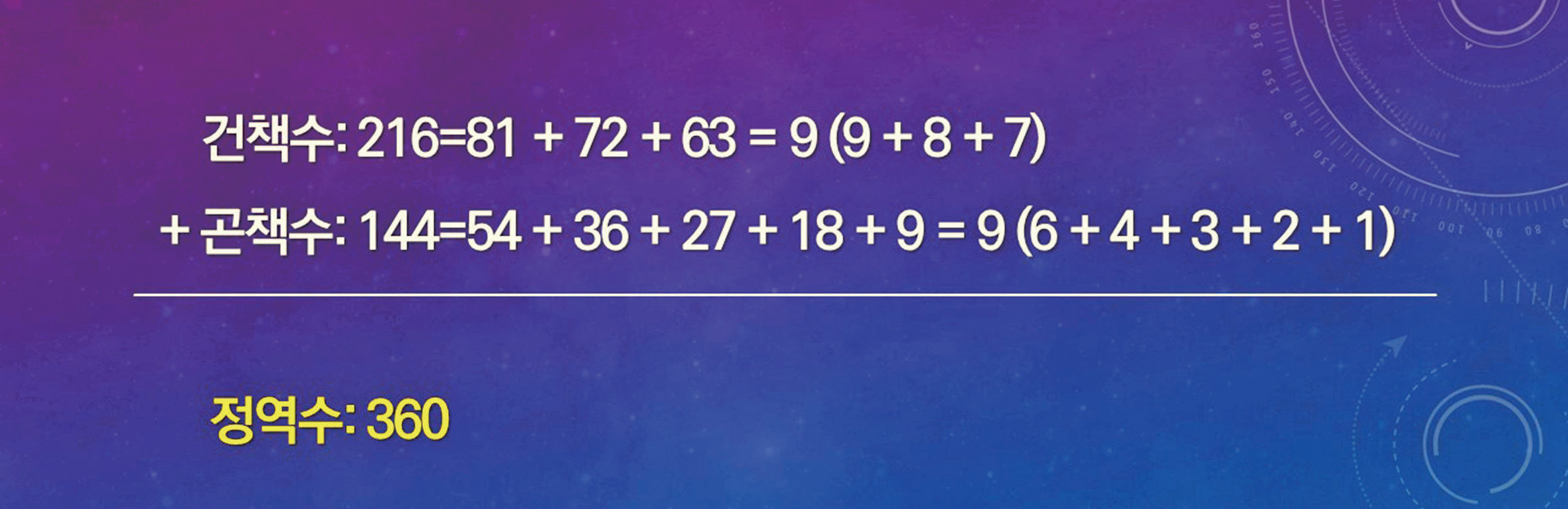 정역 도수 360은 천지 만물의 정상적인 1주기 운동 도수이다. 이는 이미 공자가 처음으로 『주역』 「계사전」에서 언급한 내용인데, 생명의 순수 양[건乾]과 순수 음[곤坤]이 각각 분열과 통일 운동을 일으키는 상수를 건지책乾之策 216과 곤지책坤之策 144라 하였고, 이 두 수를 합한 360수를 이상적인 1년 역수로 밝혀 놓았다.