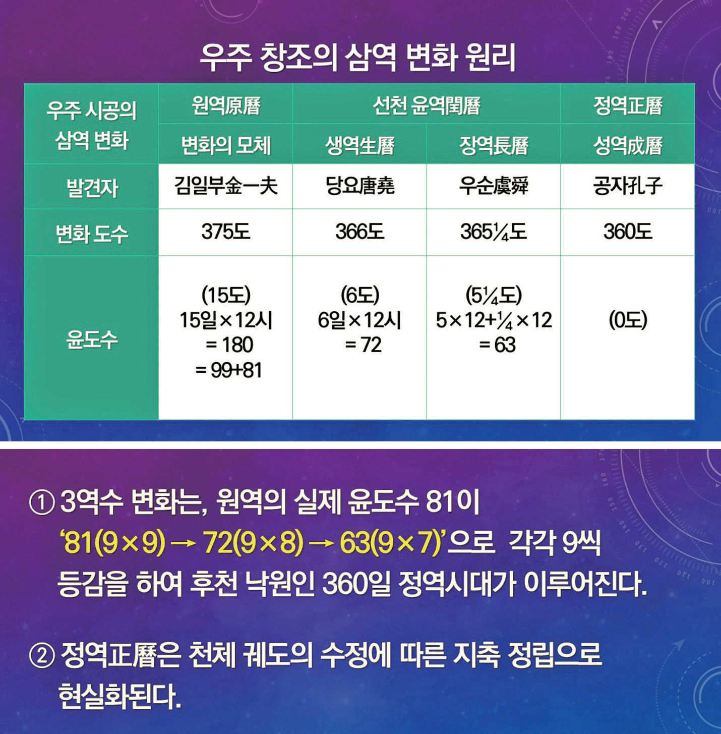만물의 생명은 이 공에서 생겨 나온 물(공간의 방위로 북방 1⋅6수水)에서 태어나 변화해 간다. 이 공은 천지 창조의 본체로서 침묵을 지키며 자신이 생해 놓은 북방에 천지 만물의 모든 운동 변화를 위임해 놓았다. 그리하여 천체의 북방이 움직이면, 태초에 설계된 원역 375의 정⋅윤도수에 따라 선후천 시공 궤도의 기본 틀이 전개되면서 거대한 우주의 윤회 바퀴가 돌아가게 된다. 지금 천체의 북극이 축미丑未(동북) 방향으로 기울어져 있기 때문에 9대 행성의 자전축도 모두 기울어져 타원 궤도로 운행하고 있다.