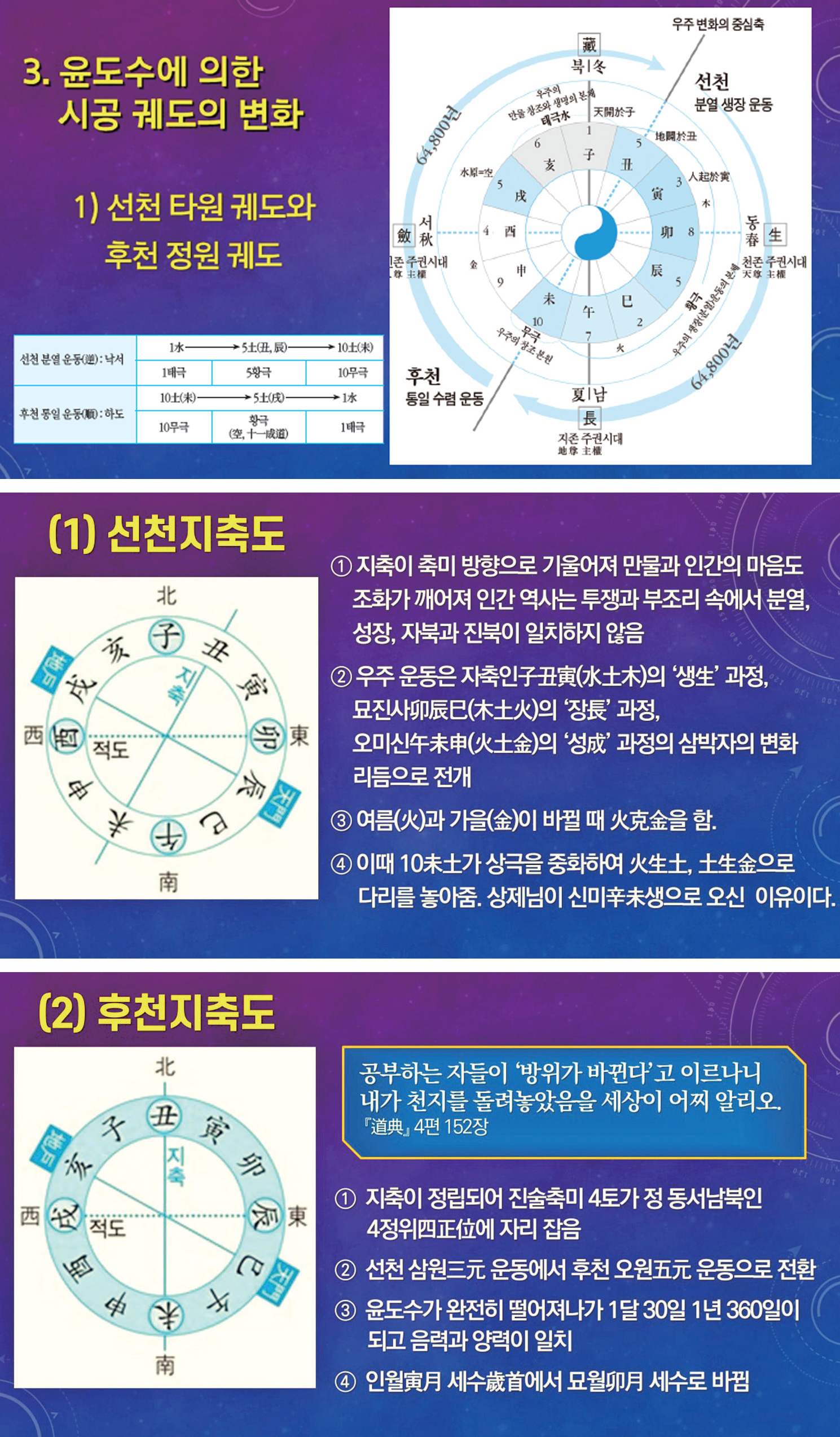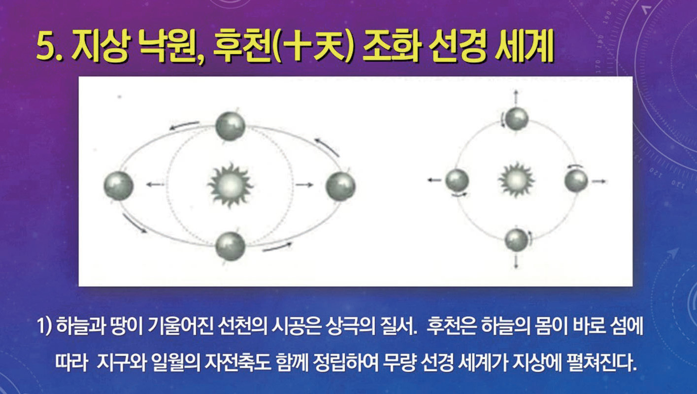 360도는 정원正圓을 형성한다. 그런데 선천 봄여름 시대의 시공 궤도는 정원에서 벗어나 타원 궤도를 형성한다. 이런 타원 궤도는 지구 자전축의 경사(23.5°) 때문에 생겨난다. 이것은 천체가 기울어져 있기 때문에 나타나는 현상으로 천체의 정립正立과 경사傾斜는 일정한 주기로 일어나게 된다. 이러한 천체의 변동 현상이 바로 우주 자연계의 천지개벽 운동이다.