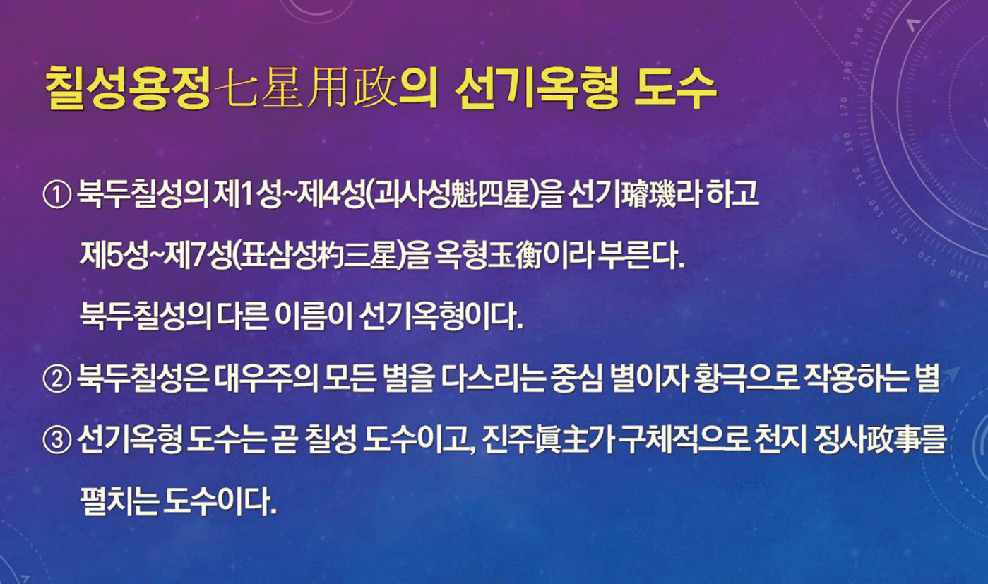 그러나 후천의 우주 가을철에는 생명을 낳고 기르는 북두칠성*3)을 중심으로 하늘의 몸이 바로 섬에 따라 지구와 일월의 자전축도 함께 정립하여 우수憂愁에 젖어 있던 대자연의 혼은 슬픔을 떨쳐내고 무궁한 희열喜悅을 구가한다.