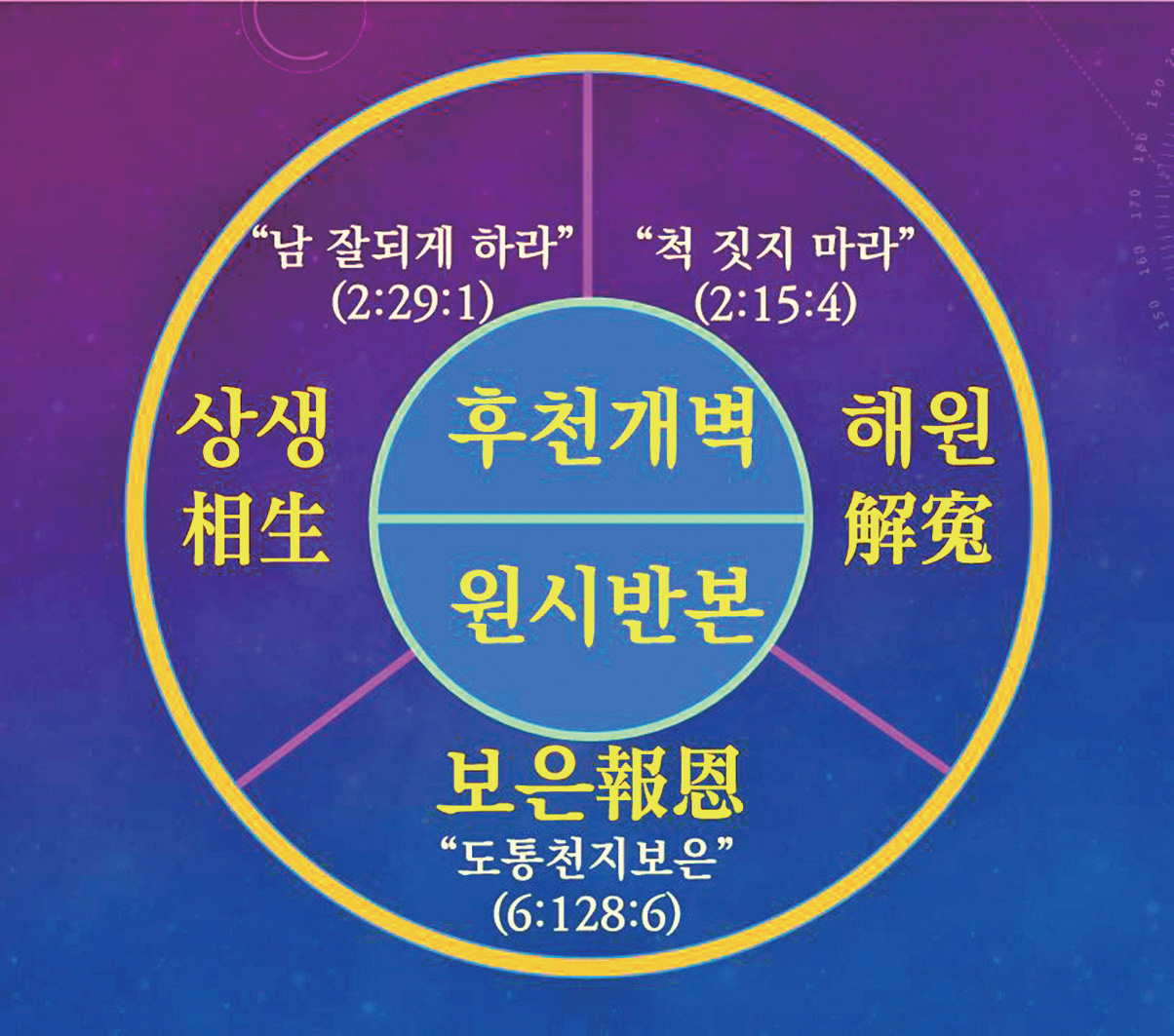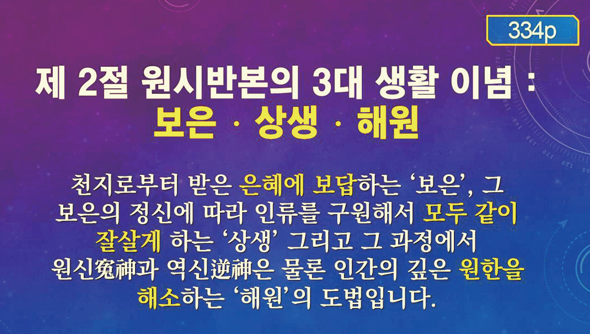 먼저 ’묵은 하늘‘이 지은 온갖 갈등과 죽음의 기운을 씻어 내는 치유의 과정을 거쳐야 한다. 병든 삼계의 치유를 위해 상제님과 수부님께서 내놓으신 처방이 바로 원시반본을 실현하는 ‘보은報恩⋅해원解寃⋅상생相生’의 도법이다. 우리는 상제님의 이 세 가지 우주 통치 사상을 실천함으로써 구원의 길로 들어설 수 있다.