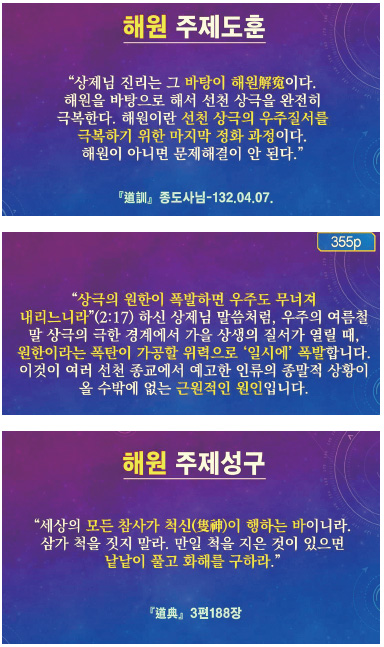 진정한 화평과 조화는 인간이 해원하여 마음의 자유를 되찾고, 묵은 하늘이 해원하여 선천 우주 상극의 시공 궤도를 벗어 던질 때 성취될 수 있다. 우주의 모든 이상은 상제님의 손길로 이루어지는 후천개벽을 거쳐서 비로소 현실화된다.
