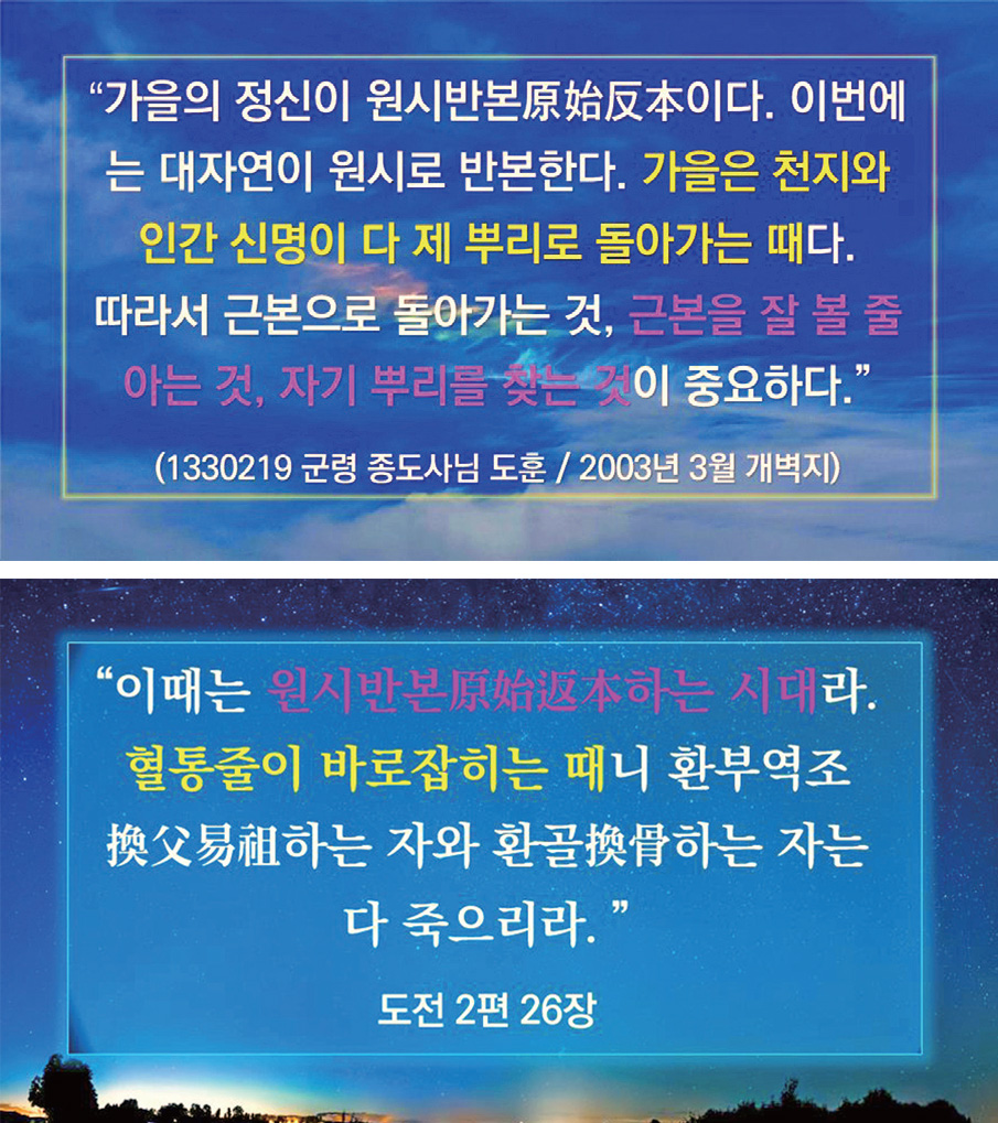 *이때는 원시반본原始返本하는 시대라. 혈통줄이 바로잡히는 때니 환부역조換父易祖하는 자와 환골換骨하는 자는 다 죽으리라. (도전道典 2:26:1~2)