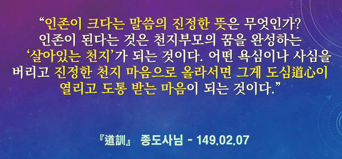‘도통천지보은’은 진리 인간으로 성숙해 가는 하루하루의 우리 삶이 곧 천지부모의 은혜를 갚는 과정이라는 말씀이다. 우리가 하늘과 땅이 무엇이고, 만물의 생명이 무엇인지 깨치게 되면 진정한 천지부모의 자녀, 진정한 인간으로 거듭나는 태일太一(인존人尊)의 길로 들어설 수 있다. 그래서 가을 개벽기에 상제님의 도를 만나, 우주의 봄⋅여름철에 천지에서 농사지은 인간을 건져내는 일은 천지부모에 대한 궁극의 보은이요 도통을 이루는 길이다.