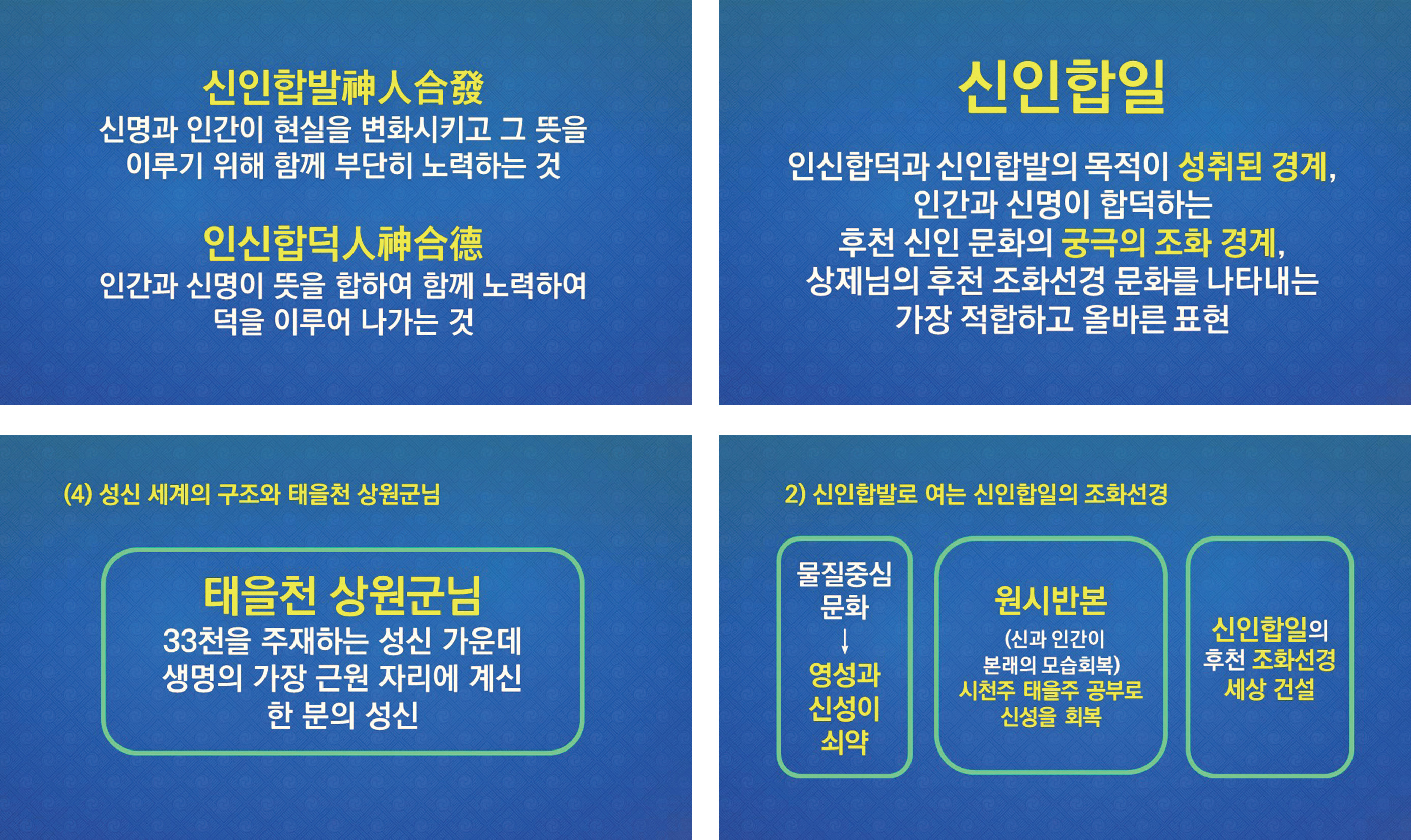 신은 대자연계의 생명과 조화의 주체로, 성신의 세계는 이성적인 깨달음이 아니라 나의 영으로 직접 체험해야 한다. 상제님께서는 원시반본하는 가을 천지의 대운에 따라, 천지의 성신과 인간이 하나 되어 사마死魔를 물리치고, 후천 조화 세상을 열어 갈 수 있게 하셨다. 천상의 신명과 지상의 인간이 합일合一하고 조화調和하여 지상에 우주의 조화 낙원 세계를 건설할 수 있도록 천지공사로써 신인神人 상생相生의 길을 열어 놓으셨다. 우리들이 신인합일로 이 현실 세계를 후천 조화선경 세상으로 만들어 우주의 꿈과 이상을 성취하게 된다.