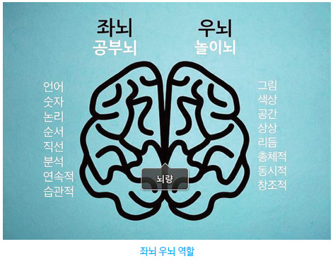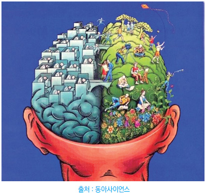 이와 관련하여 『알파벳과 여신』 책에서는 좌뇌가 생존과 이성 부분을 맡고, 우뇌가 깨달음과 영적인 부분을 맡는 것으로 되어 있어 거의 같은 논리를 펴고 있다. 동아사이언스에 실린 뇌 그림은 재미있다. 좌뇌는 감옥처럼 사무실에 갇혀 업무를 보고 있는 사람들로 가득하고, 우뇌는 연을 날리고 자연 속에서 소풍을 하며 명상을 하는 모습이 그려져 있다.