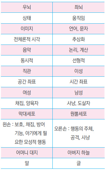 여기까지의 내용을 도표로 정리해 보면 문자와 이미지에서 뇌의 구조, 남자와 여자, 그리고 가장 크게는 천지부모에 대한 이야기로 확장하고 있다. 문자와 이미지라는 분류 기준으로 문명의 모든 것을 음양으로 분류하고 있는 것이다.